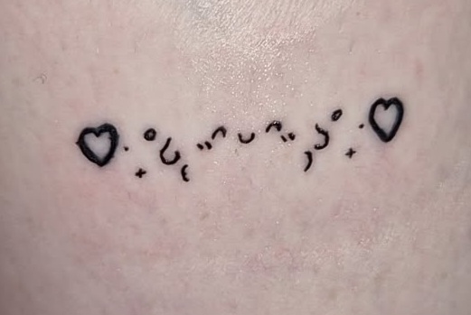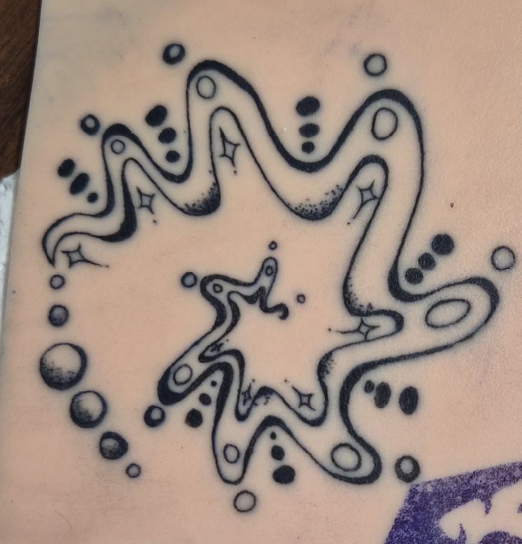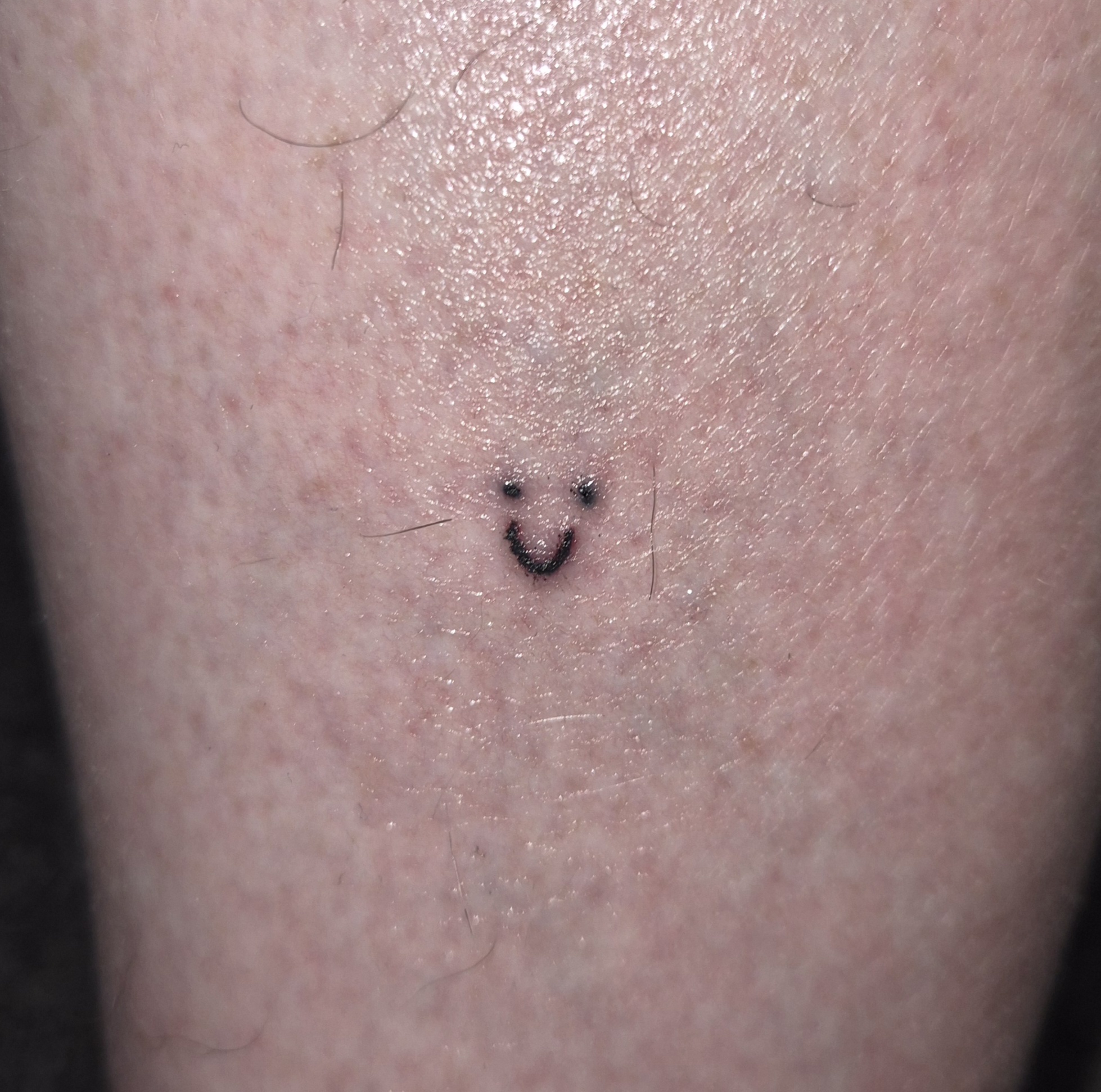 This was the first tattoo I did on real skin and it is on my dad's leg, just a tiny smiley face that took about 10 seconds. I don't remember what size needle I used.