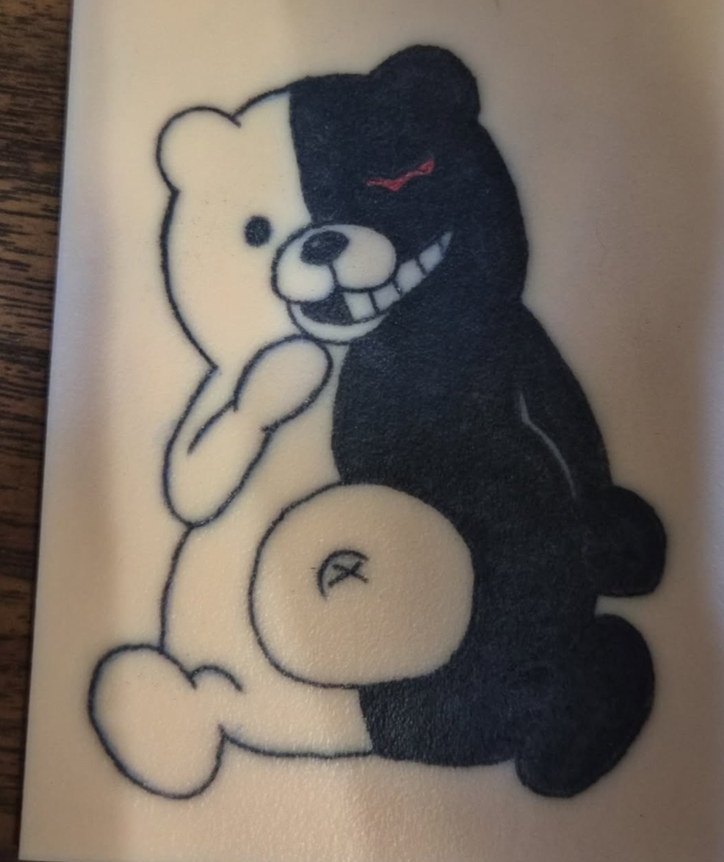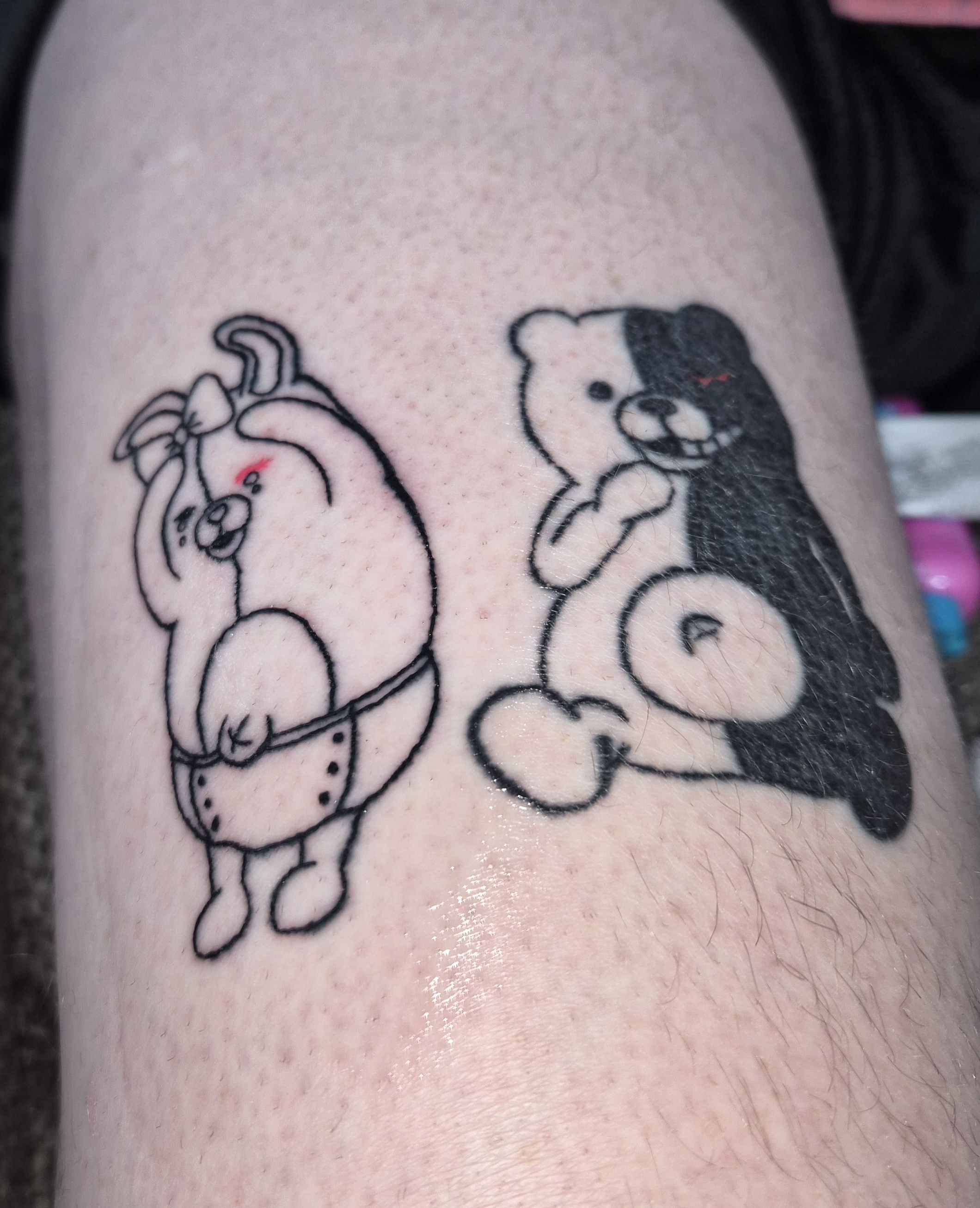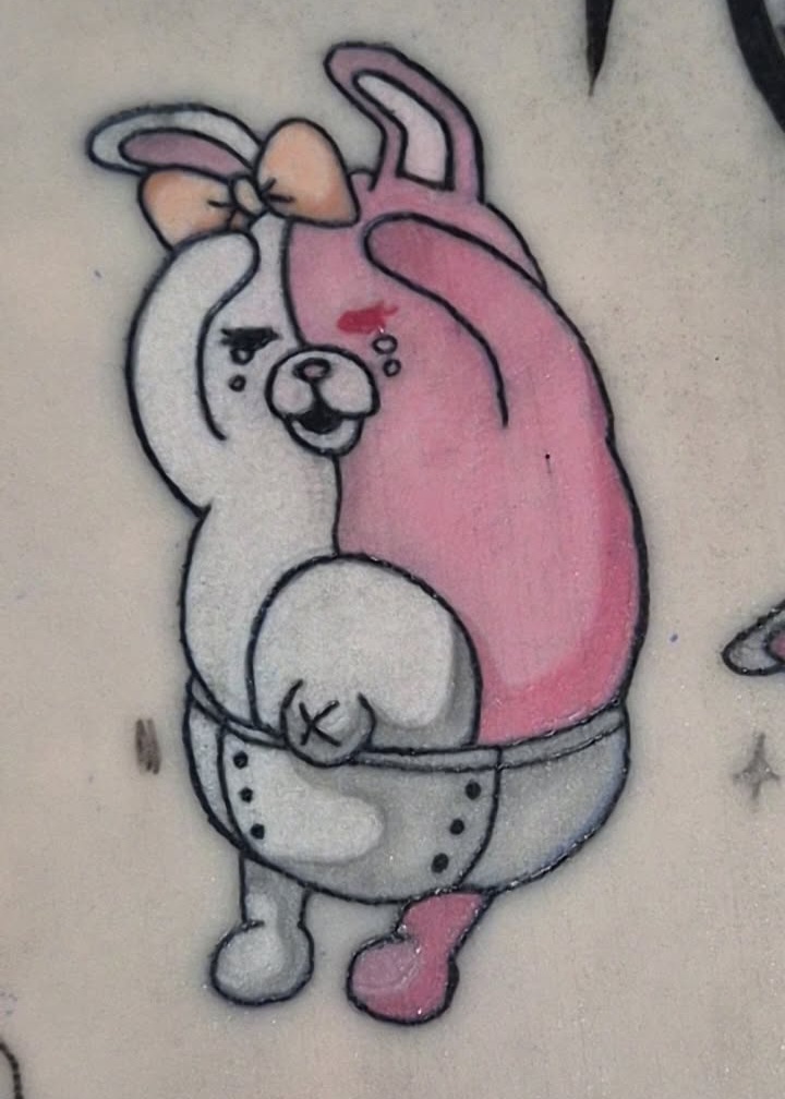 This is another one on my dad. I did Monokuma first and Monomi's outline a few weeks later. I used a 9rl for the lines on Monokuma, 11rl to fill in the black, 7rl and 5rl for the lines on Monomi. I will be doing the color on her soon.